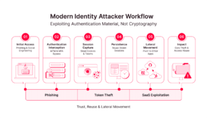 Most successful identity breaches follow a predictable sequence that targets authentication material, not cryptography. The attacker never breaks cryptography – they abuse trust and reuse.